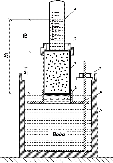 1. Сосуд 5 заполнить на 2/3 объема водой. Цилиндр с песком 1 установить на подвижную площадку 6, вращая гайку 7, опустить его в воду и выдержать до полного водонасыщения (потемнения поверхности) песка.